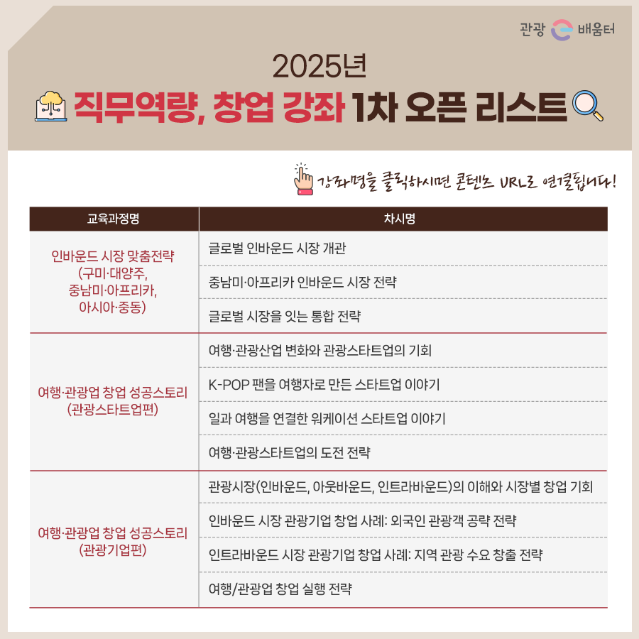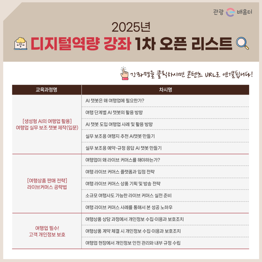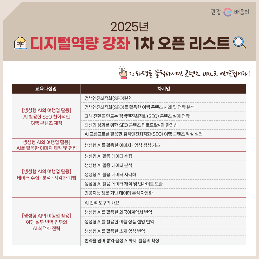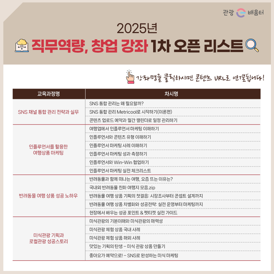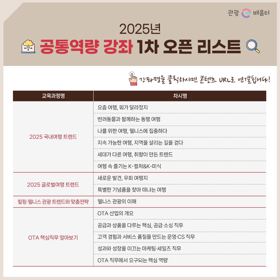 [카드뉴스_2025 신규강좌 소개] 콩심은데 콩나고 관광e배움터에 신규 콘텐츠 난다